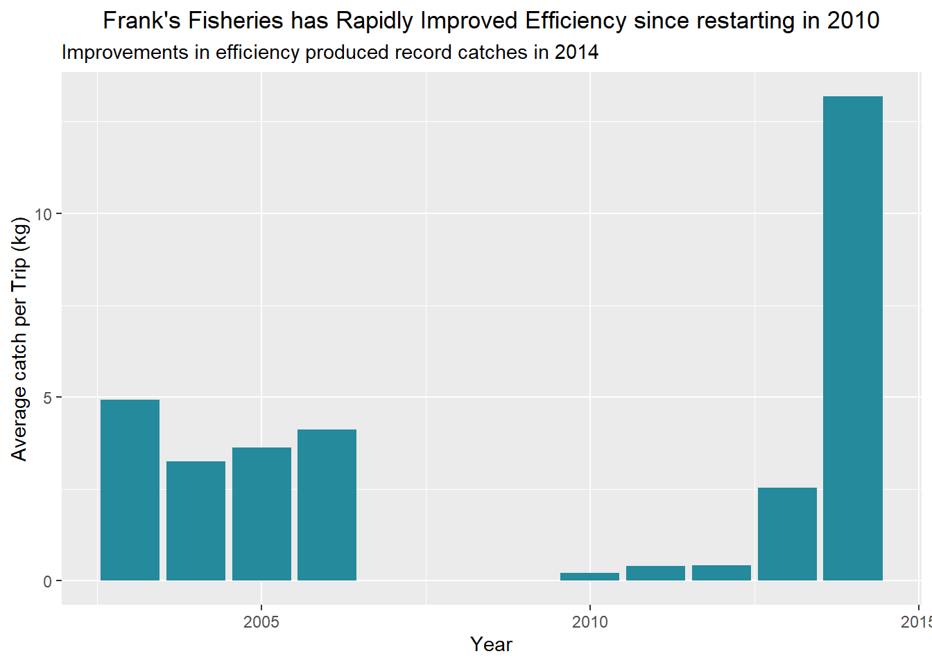 labs(title = "Frank's Fisheries has Rapidly Improved Efficiency since restarting in 2010",