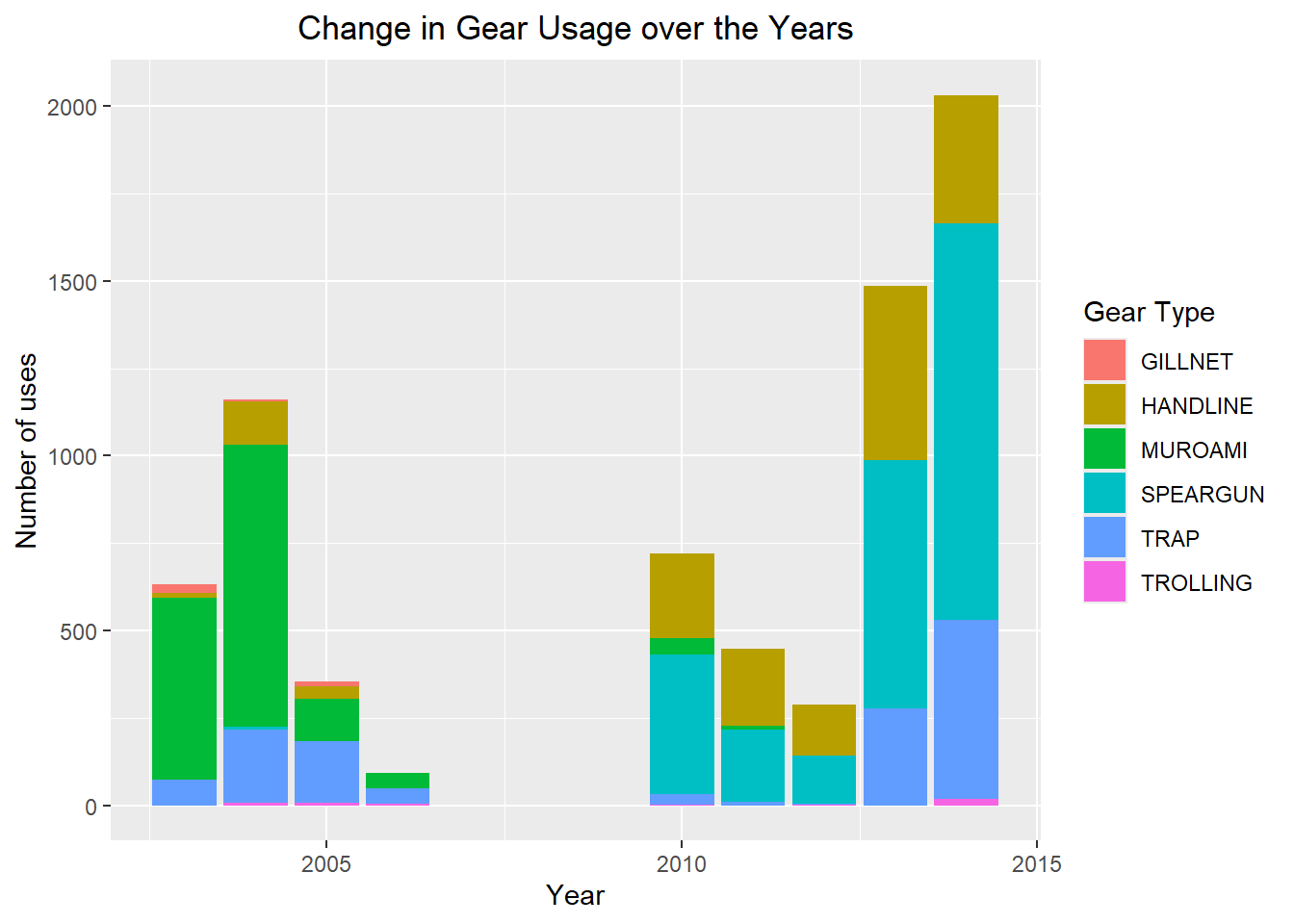 x = "Year", y = "Number of uses", fill = "Gear Type")+